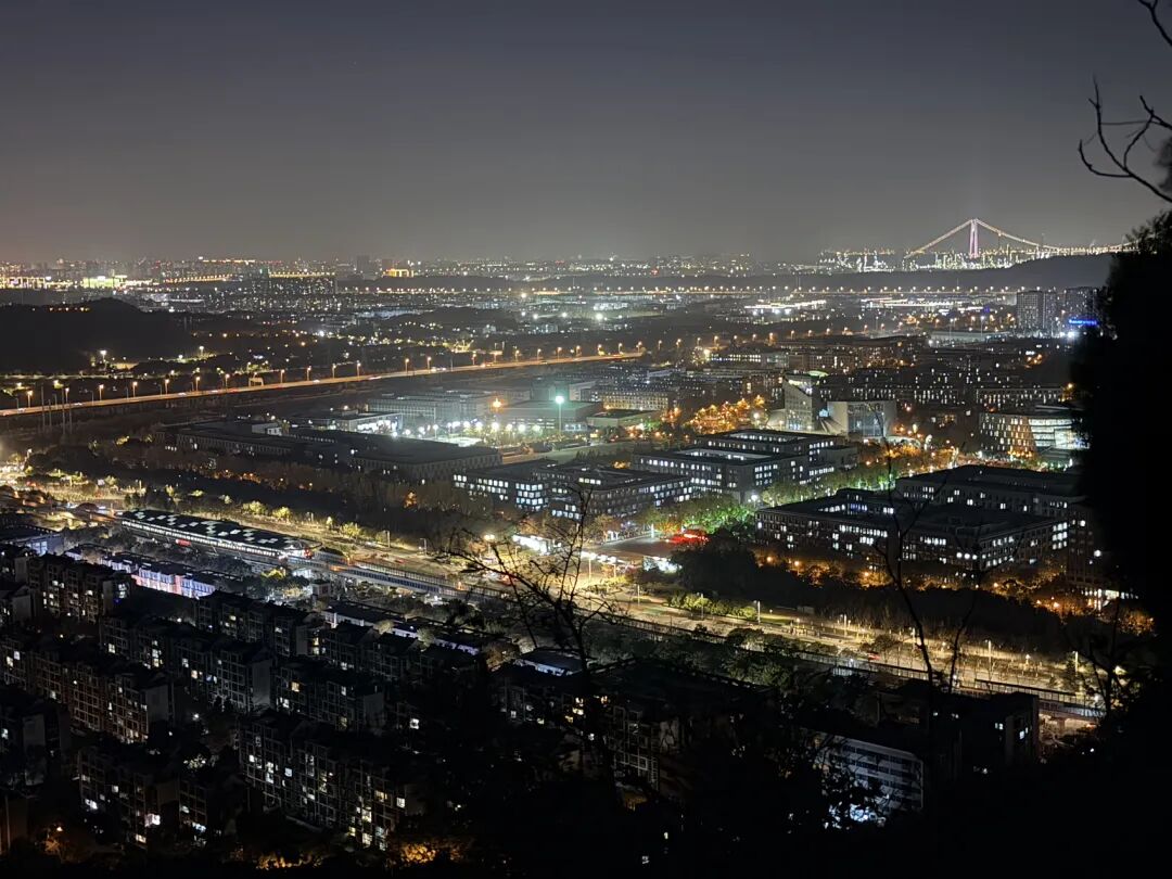 图中大部分都是南大仙林校区的建筑,杜厦图书馆、方肇周体育馆都清晰可见。远处是南京绕城高速,再远一点可以看到栖霞山长江大桥。